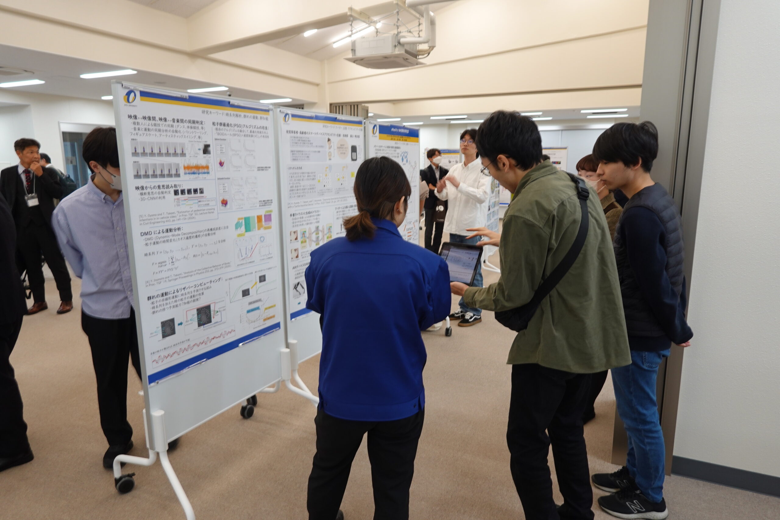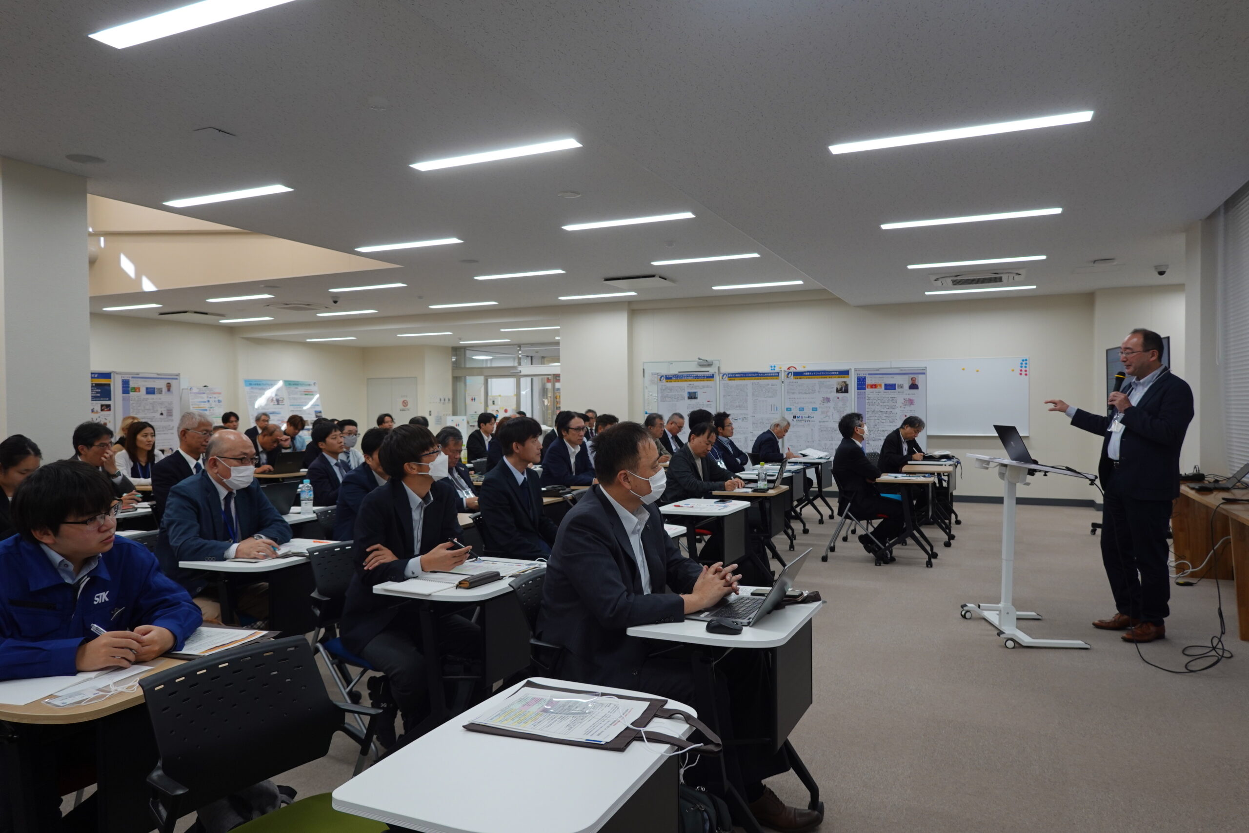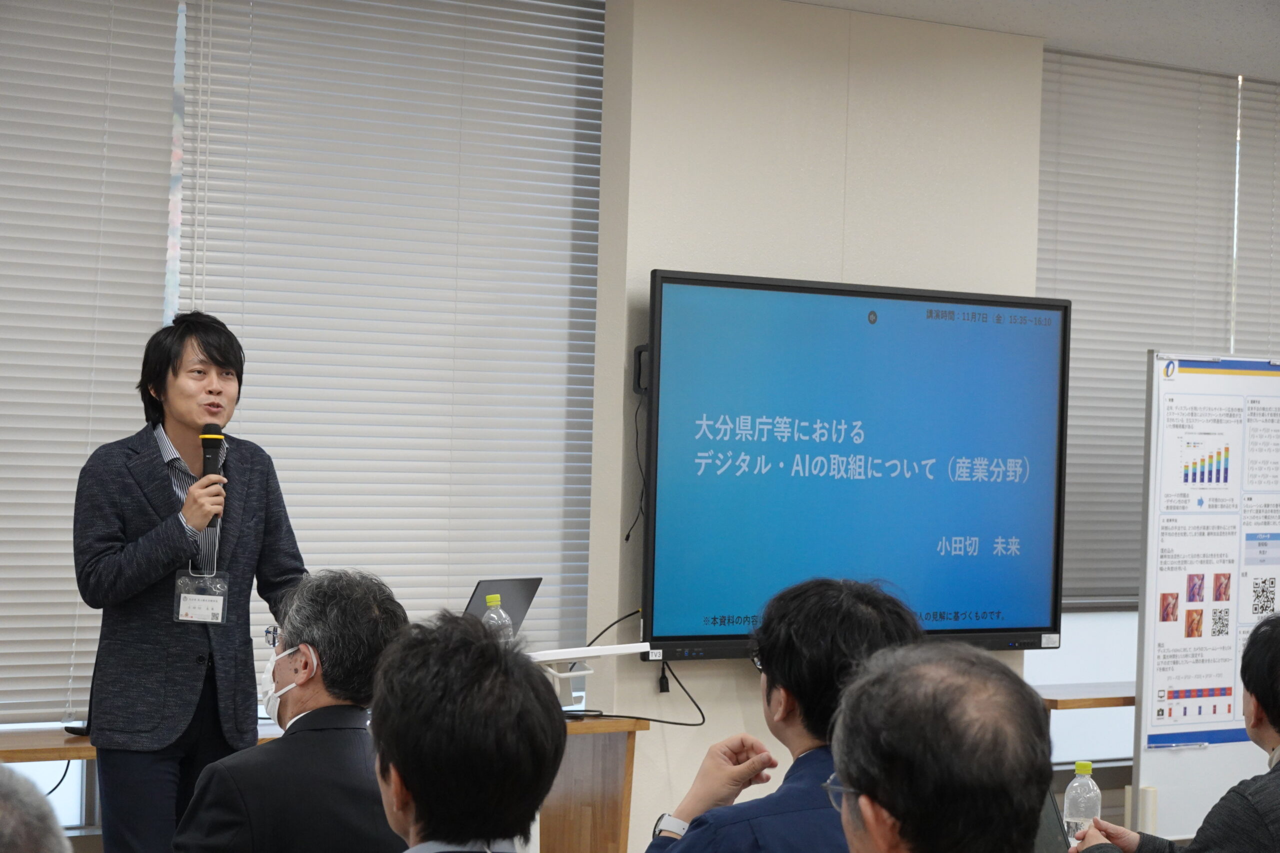 講演会では、大分県商工観光労働部 小田切未来部長、事業創造大学院大学 黒田達也学長、(株)オーイーシー 野﨑浩司上席執行役員、(株)新潟人工知能研究所 佐藤修一取締役を迎え、様々な地域課題をAI・DX技術で変える取り組み例や将来構想の紹介がありました。パネル展示では、本学の最新研究を企業・県関係者へ紹介しながら、自由な対話交流が図られました。